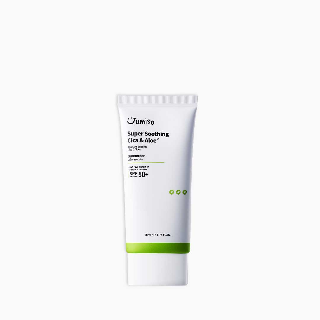 Jumiso Super Soothing Cica & Aloe Sunscreen SPF50+ PA++++ is a skin care product designed to provide sun protection and hydration to the skin. The sunscreen has a high SPF of 50+ and PA++++ rating, offering broad-spectrum protection against UVA and UVB rays. The product contains cica, also known as centella asiatica, which is known for its soothing and calming properties, and aloe vera, a natural ingredient known for its hydration benefits. The formula is lightweight and absorbs quickly into the skin, making it suitable for use under makeup or as a daily moisturizer. The product comes in a convenient tube packaging.